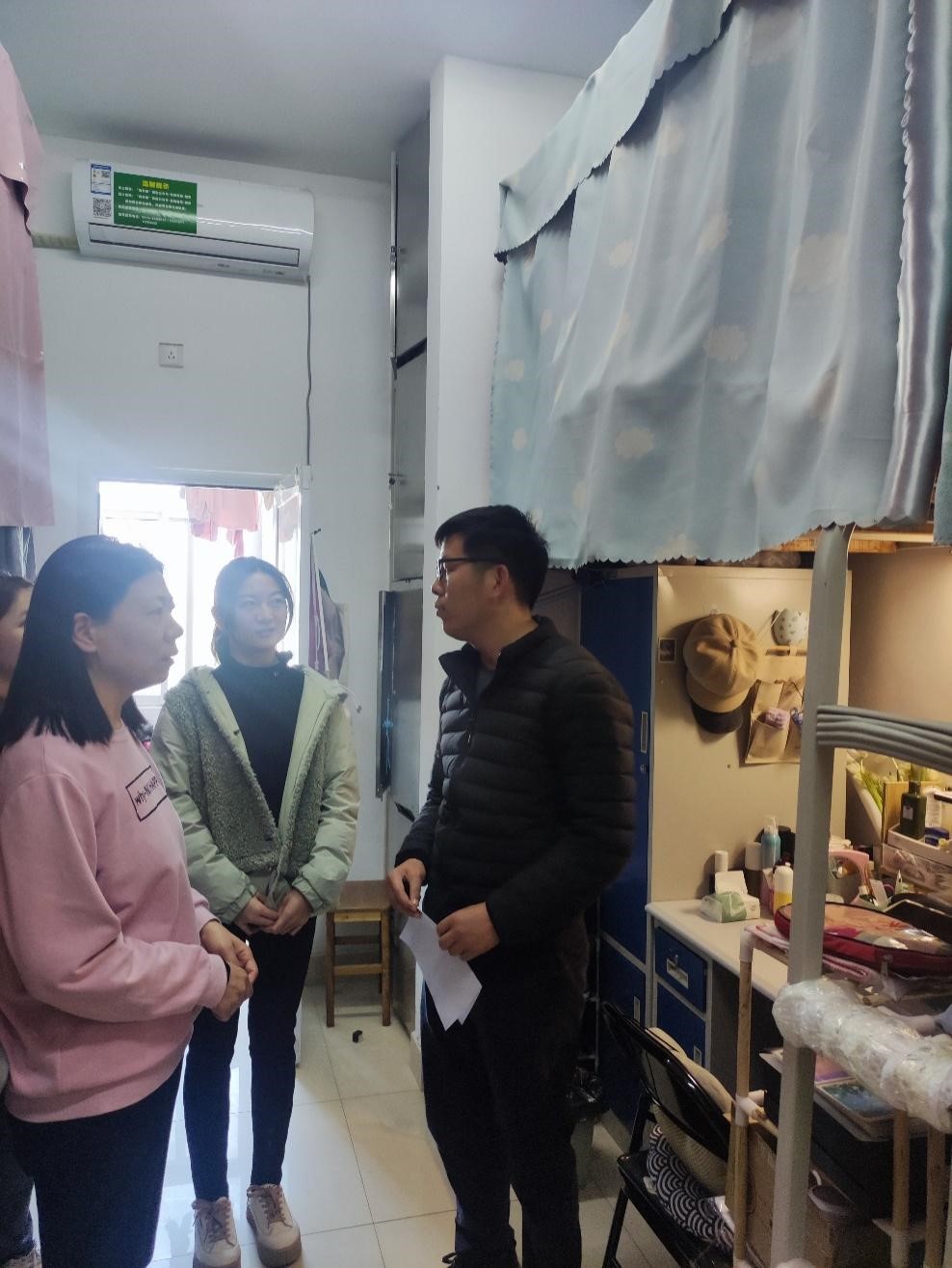 3月18日下午,学院副院长李艳灵、研究生秘书李健走访研究生宿舍,重点查看了宿舍卫生、用电安全规范等情况。同时询问了学生们的学习生活状况,叮嘱大家要努力学习,顺利完成研究生学习任务。