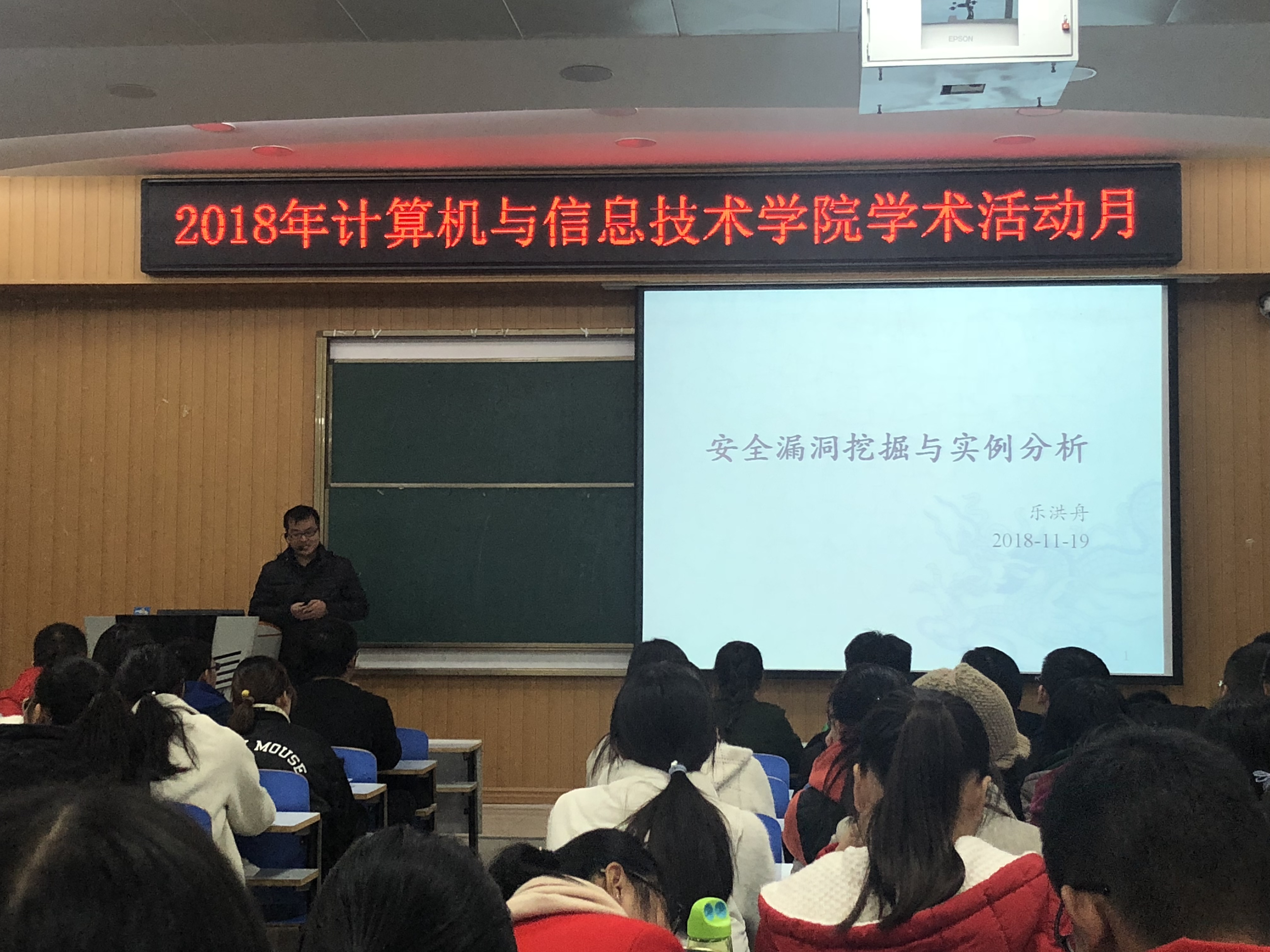 11月19日下午,信阳师范学院williamhill中国尤赵鹏、乐洪舟博士在计算机楼107教室分别作了题为“面向闪存的纠错码方法研究”和“安全漏洞挖掘与实例分析”的学术报告。计算机学院副院长黄俊、冯岩和李国梁等学院领导、学院部分教师、全体研究生以及部分本科生参加了报告会。报告会由williamhill中国副院长冯岩主持。