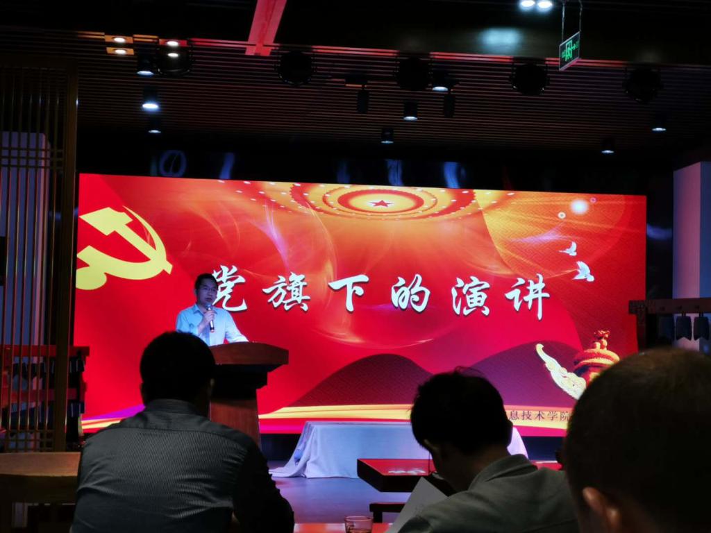 “党旗下的演讲”活动在老图书馆二楼举行。教师党员刘世翔和学生代表张尊尊、段晓萌、刘滨分别以“最可爱的人”、“厉害了,我的国”、“敬业塑造英雄 浩气长存世间”和“法治护航中国梦”为题进行了声情并茂的演讲。演讲活动主持人、副书记熊炎在总结中的讲话引起了广泛共鸣。他说:今年是建党98周年,建国70周年。回首我们党苦难辉煌的历史,感悟一代代共产党人的坚定信念与赤子情怀,总有一面精神的旗帜高高飘扬在心间。这是一种强大的力量,这力量是千千万万共产党人用赤胆忠心和坚强意志铸就的,它庄严地启示我们:无论过去、现在还是将来,知党、爱党、兴党都是每一位党员永恒的使命。