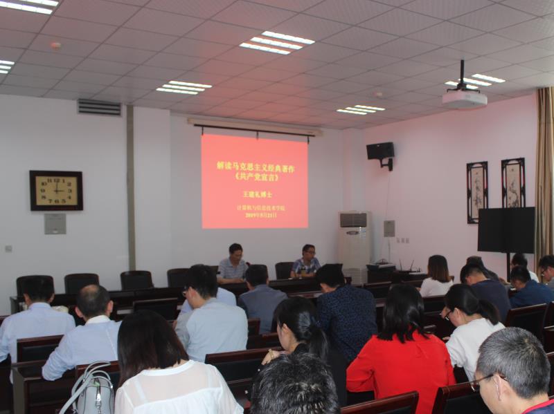 讲座在计算机学院410会议室举行,由学院副书记、副院长冯岩主持。王建礼从《共产党宣言》产生的时代背景、《共产党宣言》的内容及其基本立场和观点、《共产党宣言》与中国特色社会主义的关系三个方面进行了深入浅出的解读。讲座内容系统、分析透彻、见解独到,受到了广大党员的欢迎。大家表示开阔了眼界,受到了启迪;理解了马克思主义理论武装对党员成长的重要意义,领会了习近平总书记提出的 “要在常学常新中加强理论修养”的要求。