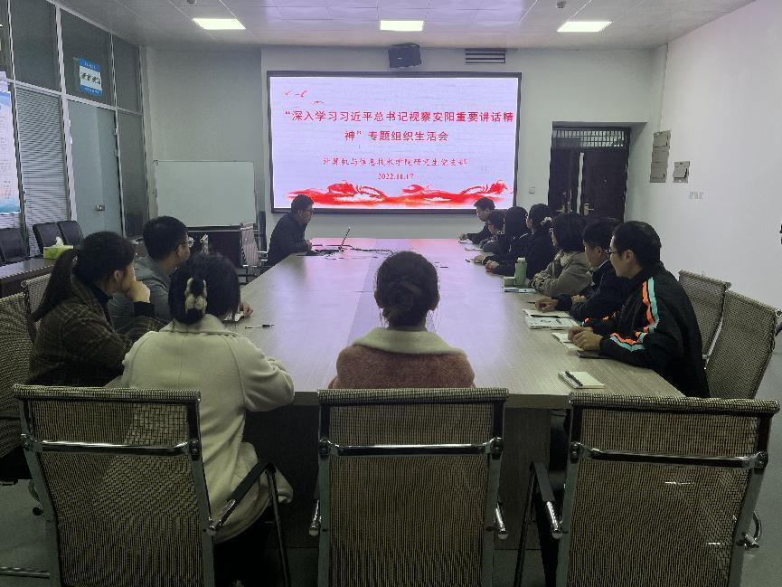 11月17日下午17点,我院研究生党支部在计科楼203会议室召开“深入学习习近平总书记视察安阳重要讲话精神”专题组织生活会,研究生党支部全体党员参加,会议由支部书记李健主持。