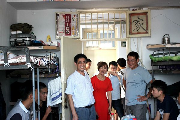 9月11日下午,williamhill中国院长邬长安,党委书记刘党英,副院长黄俊、刘宏兵,副书记谢蕾,以及杨帆、刘勇、陈星雨、张钰老师来到新生宿舍23号、25号楼,慰问2016级新同学。
