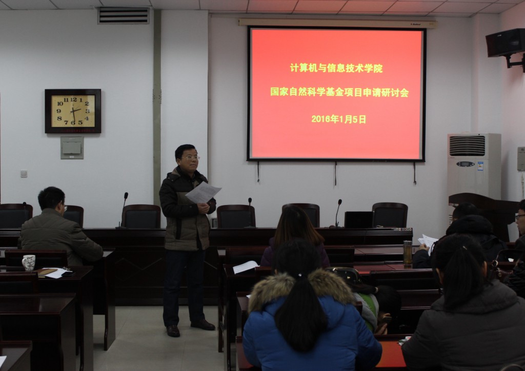 为做好我院2016年度国家自然科学基金申报工作、进一步提高项目申报质量,1月5日下午,学院在计算机楼401室召开了2016年度国家自然科学基金项目申报研讨会。计算机学院院长邬长安、书记刘党英、副院长黄俊、副院长刘宏兵、2016年度国家自然科学基金项目申报人、校内指导专家以及部分老师共计20人参加了研讨会。会议由副院长刘宏兵主持。