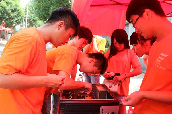 挥洒青春汗水求人生真知,无私奉献获坚毅之志。为充分发挥专业知识,更好的服务人民,解决群切实困难,真正做到学以致用,7月5日,计算机学院志愿者联合物电学院在计算机学院团总支老师杨帆、物电学院团总支老师张康华、社团指导老师纪晓群的带领和指导下带着维修工具、帐篷等活动器材早早的来到飨堂社区,顶着炎炎烈日为当地居民义务维修电脑和家用电器。