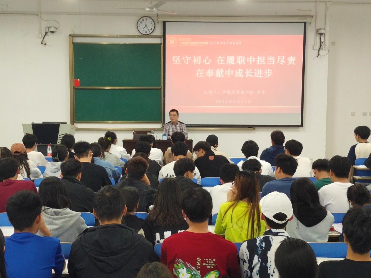 5月24日,我院在计科楼106教室召开学生干部培训会,学院党委副书记李奎主讲,学院学生干部培训班全体学员共同参与此次会议。