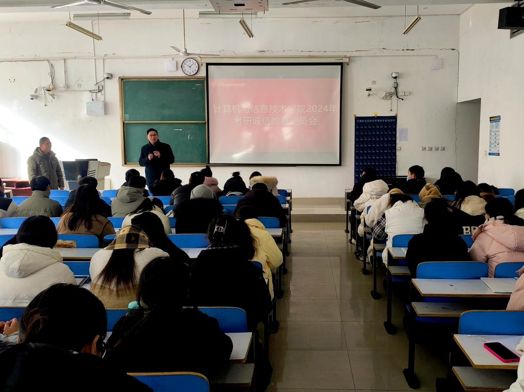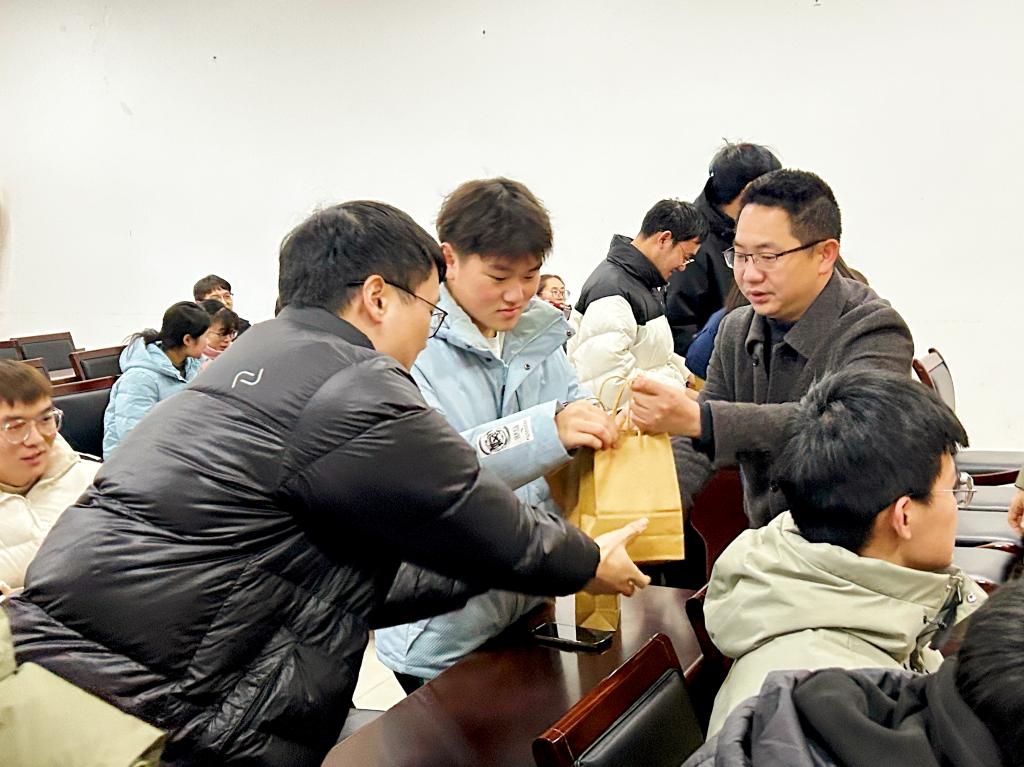 活动中,院领导和毕业班辅导员通过走访宿舍和微信推送等方式,为学生送上真挚祝福,对日夜奋斗、努力拼搏的“考研儿”给予充分肯定和鼓励。21日,院党委书记熊炎、党委副书记李奎和2020级学生辅导员王丝雨为考研学生精心准备了心想事“橙”(黄金橙)、轻巧上岸(巧克力)、喜笑“研”开(娃哈哈)、温暖人心(暖贴片)等小礼物,在将这份“冬日暖心包”送给大家的同时,也传递了衷心的祝愿和浓浓的关爱。熊炎强调,在这个关键时刻要坚定信念,稳住心态,一鼓作气,现在要战胜的不是别人而是自己,请同学们抛开考研过程中的负累与惶惑,以坚定、自信、从容的心态走向考场,无论考研的结果如何,你们都是一个值得尊重和骄傲的人,你们都是自己的英雄。李奎讲到,考研过程中,完成比完美更重要,小小礼包寓意满满,希望考研学子都能得偿所愿,不负这段默默付出的岁月。22日,“2024年考研诚信教育动员会”在计科楼101举行,院长冯岩、党委副书记李奎以及2020级学生辅导员张莉、王丝雨参加会议,2020级全体考研学生参会。会上,冯岩为大家细致解读了考场要求和考试纪律,尤其强调了诚信考试的问题,叮嘱大家珍惜个人名誉、遵守法律法规、勿抱侥幸心理、争当诚信考生。