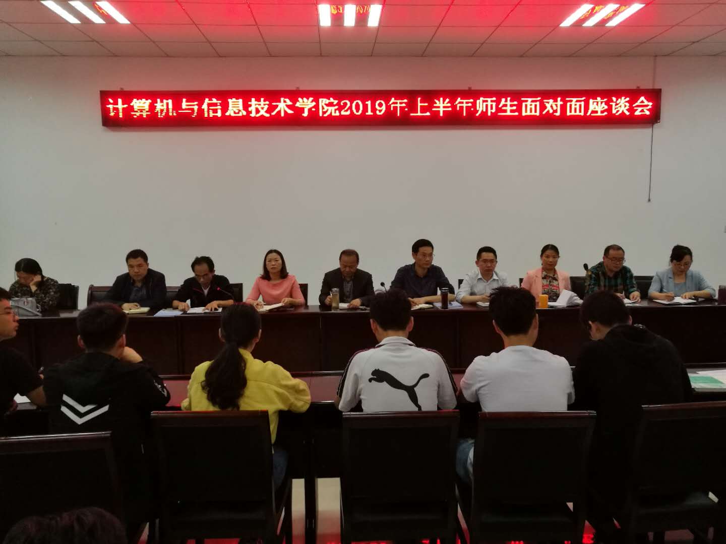 5月13日晚上,williamhill中国2019学年上半年师生面对面座谈会在计算机楼410会议室举行。学院全体领导班子成员,各专业负责人和学生代表共50余人参加了座谈会,会议由学院副院长黄俊主持。